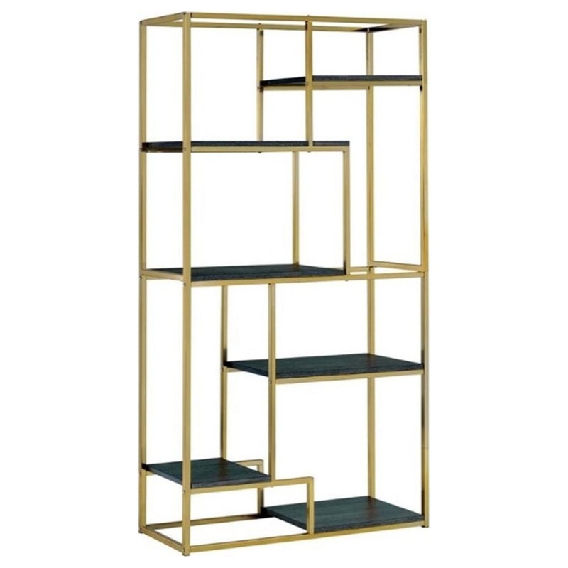 Features: -Finish: Champagne -Multi-leveled geometric design -Materials: Metal, Veneers -Dark wood shelves -6 shelves Specifications: -Overall Product Dimensions: 70.25" H x 38" W x 13.25" D -Overall Product Weight: 59 lbs -Seat Depth: 11.75"Product ID1275