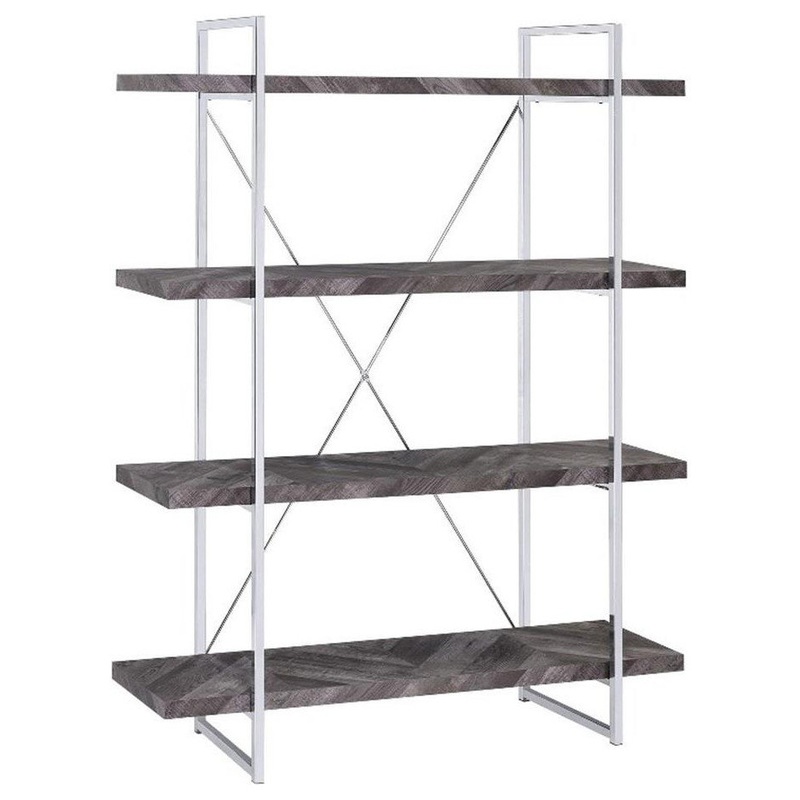 Perfect for storage or display, this wooden bookcase exudes understated glamour. Its frame is comprised of crisp, clean metal lines with an eye-catching, X-shaped design on the back. Its shelves are crafted with high-quality wood for added sturdiness and durability. A rustic gray herringbone finish blends beautifully with the high-shine chrome finish of its frame. With its simple yet stately design, this contemporary bookcase is a stunning addition to any modern home.