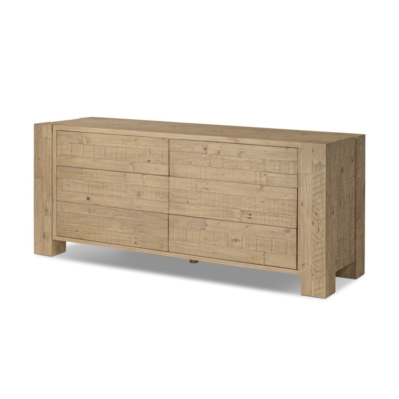 Beauty in simplicity. A clean, spacious six-drawer dresser of blonde-finished pine can be styled into a wide range of styles thanks to its neutral versatility.