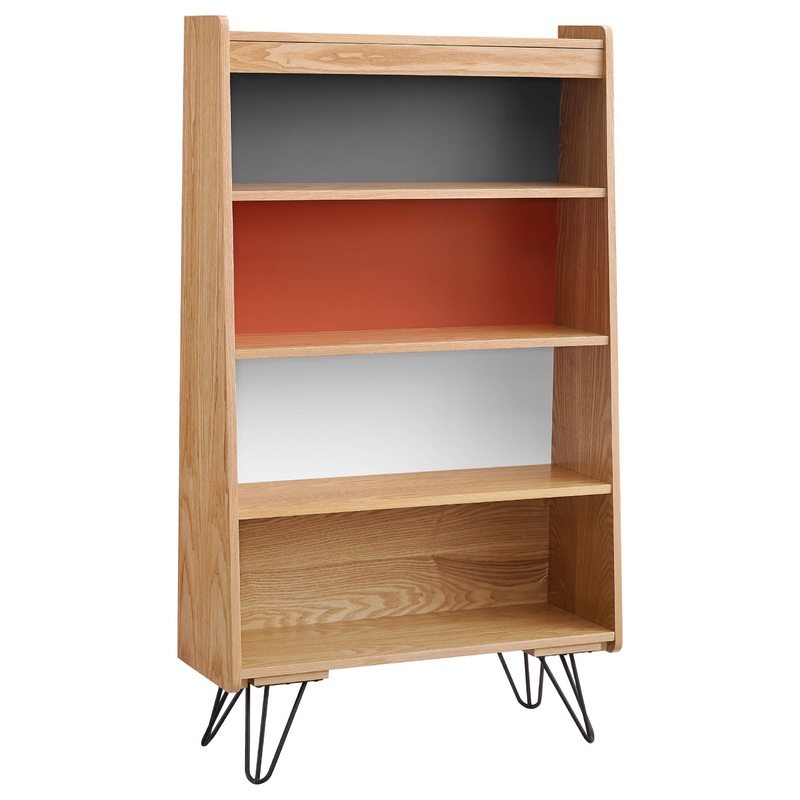 Add contemporary style and storage to your home with the Perry Bookcase. Four shelves provide ample storage and display space. White, orange and gray shelf backs add a pop of color to the ash veneer frame. Iron legs keep the piece sturdy.