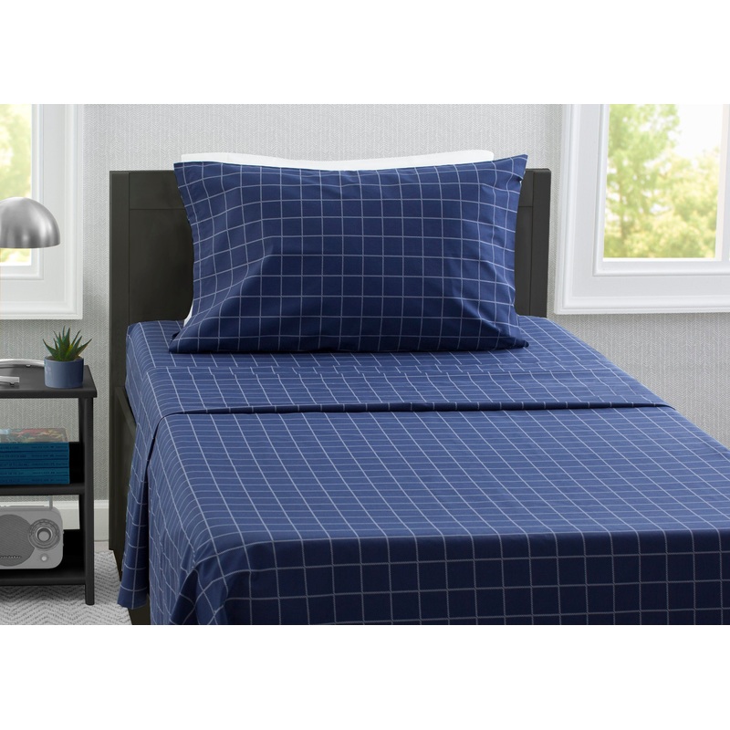 Sweet dreams start with this 3-Piece Twin Sheet Set by Delta Children! Soft, comfortable and perfect for your child’s bedroom, the set includes one flat top sheet, one fitted sheet and one standard pillowcase. Adorned with a cool plaid pattern, its classic style effortlessly blends with any dcor. The soft cotton-blend construction is machine-washable, which makes it incredibly easy to keep these sheets looking and feeling new. Buy a few sets, theyre great for everyday use in your childs bedroom, in the guestroom or any bedroom, in fact.