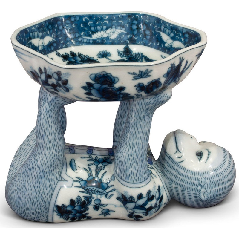 A ceramic monkey bends over backwards to proffer soaps, potpourri, even paperclips from a classic lotus motif dish. A unique decorative object with a practical use.