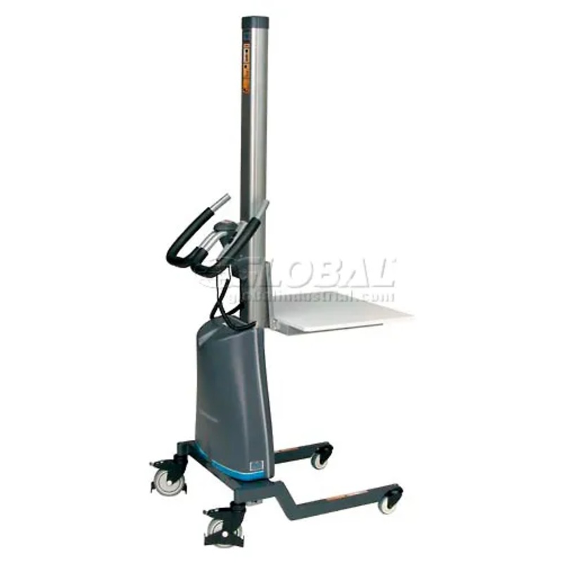 The PrestoLifts Lift Stik Truck is the most versatile lifter and transporter on the market. Sleek, attractive and user-friendly machine is ideal for use in test and measurement stations, office supply rooms, electronic assembly areas and computer server rooms. Continuous lifting chain provides smooth starts-stops and precise load positioning with zero drift. Enclosed aluminum mast and sealed motor cover offer a clean design, allowing it to be used in laboratories and offices with no risk of hydraulic fluid leaks. Oversized ergonomic “sponge-grip” handle provides operator comfort. Two speed pressure sensitive lift control is conveniently mounted on the handle and features a coiled cord for remote operation. Durable powder coated steel frame and fixed steel forks with a ” thick removable UHMW polyethylene platform are designed for years of service. Battery status indicator and onboard 115V quick-charge battery charger included. Office lift truck rolls smoothly on non-marring gray rubber wheels (2 swivel steer wheels with brakes and swivel locks for straight line movement; 2 swivel load wheels). Limited 2 Year Warranty.