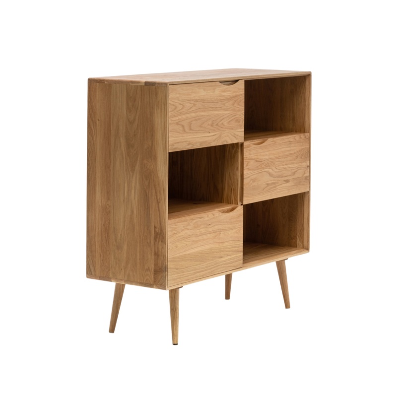 Create a stylish and functional storage space with this spacious and understated modern wooden highboard. With three open storage units and three with minimal style doors, you can easily stash away your books, plates, and other household items. Handcrafted