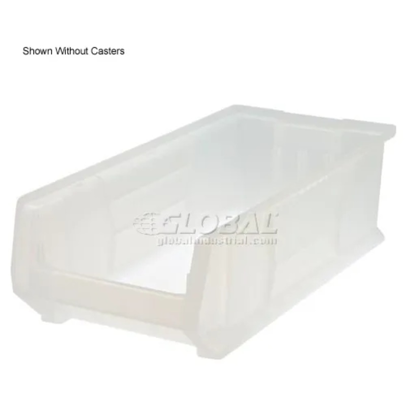 CLEAR VIEW PREMIUM HULK STACKING BINS Mobile Hulk Bin Clear premium hulk stacking bins organized and store your large, bulky items with ease. Made using strong injection molded tri-clear polypropylene that is FDA approved. 24W bins store large items and fit extra deep shelving units. Reinforced walls add strength and rigidity and wide top ledge permits stable, higher stacking for stackable storage. Plastic stacking bins are waterproof, corrosion resistant, withstand cold temperatures and autoclaves up to 250F. Front, back and side grips allow easy handling. Anti-slide stop prevents shifting when stacked. Mobile Bins include casters for easy mobility when loaded.