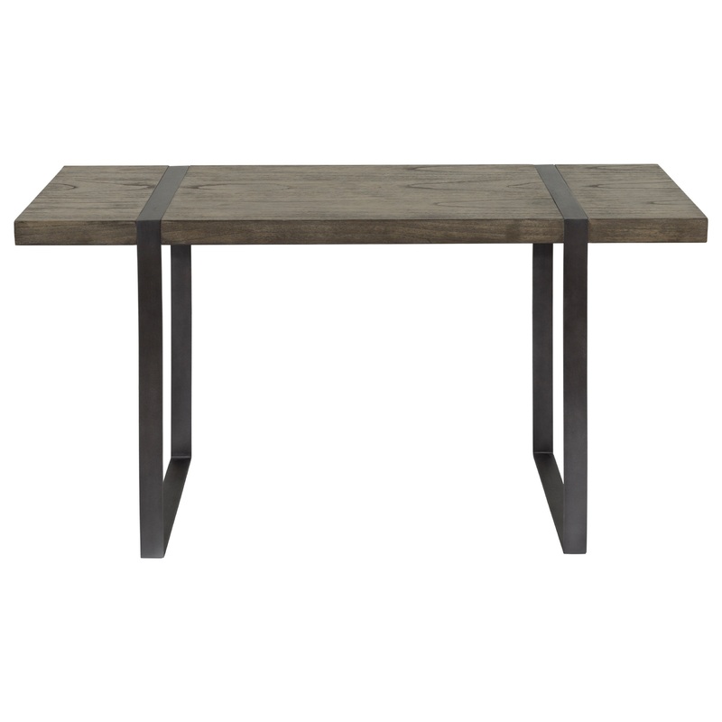 Objects float with the Mikel Welch Rail Console Table. Mindi wood top in hand painted Vintage Driftwood finish showcases natural beauty of the wood grain. The legs, crafted from hand formed steel in Cast Steel finish, are wrapped and inlaid over the Mindi wood top. Perfect for use as a narrow desk, console, or sofa table.