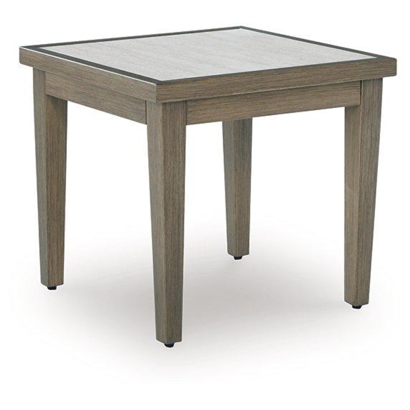 Experience the perfect combination of durability and style with this outdoor end table. An aluminum frame with a wood-look finish maintains a sleek, contemporary aesthetic, while the sintered stone tabletop adds an element of natural elegance. This delight