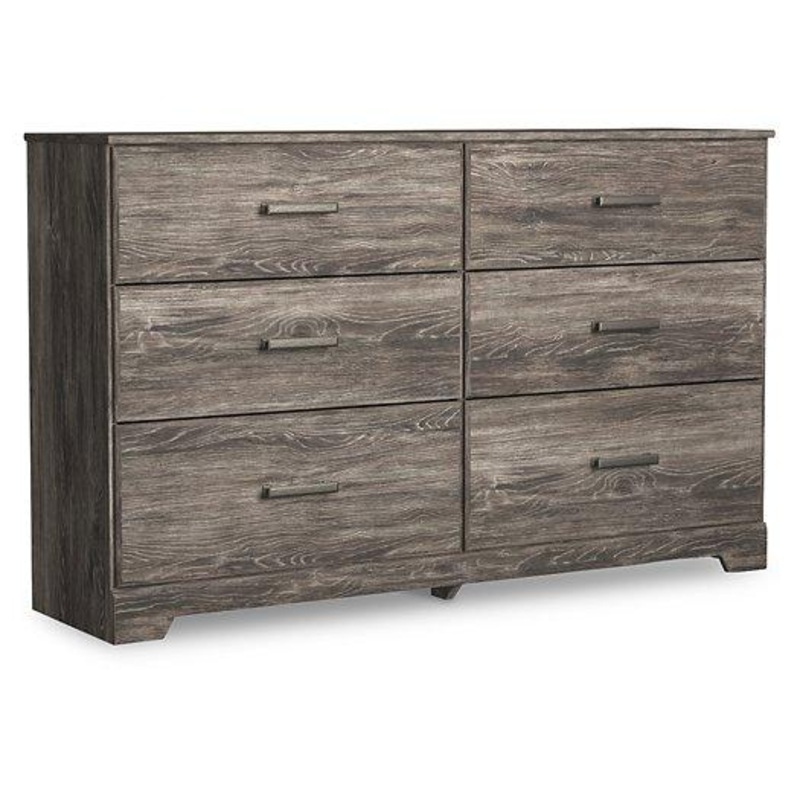 With its clean-lined look and modern attitude, this dresser is a fresh style awakening. A warm gray hue over replicated oak grain easily complements other furniture finishes. Smooth drawer fronts with antiqued pewter-tone handles complete the aesthetic. Mo