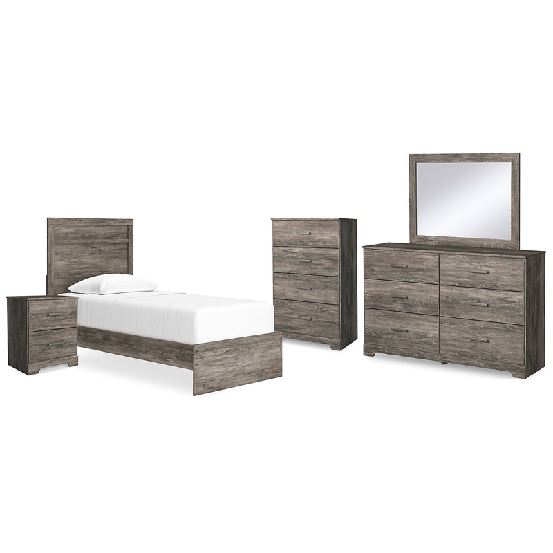 Details B2587B11: Includes headboard, footboard and rails, Made with engineered wood (MDF/particleboard/plywood) and decorative laminate for the right balance of affordability and durability, Rustic warm gray finish over replicated oak grain with authentic touch, Decorative laminate replicates natural or man-made material surfaces with consistent color, pattern and texture , Foundation/box spring required, sold separately, Mattress not included, sold separately, Minor assembly required, B2587B1: Made with engineered wood (MDF/particleboard) and decorative laminate, Rustic warm gray finish over replicated oak grain with authentic touch, 6 smooth-gliding drawers, Large scale pewter-tone handles, Mirror attaches to back of dresser, Assembly required, B2587-44: Made with engineered wood (MDF/particleboard/plywood) and decorative laminate for the right balance of affordability and durability, Rustic warm gray finish over replicated oak grain with authentic touch, Large scale pewter-tone handles, 4 smooth-gliding drawers, Safety is a top priority, clothing storage units are designed to meet the most current standard for stability, ASTM F 2057 (ASTM International), Drawers extend out to accommodate maximum access to drawer interior while maintaining safety, B2587-92: Made with engineered wood (MDF/particleboard/plywood) and decorative laminate for the right balance of affordability and durability, Rustic warm gray finish over replicated oak grain with authentic touch, Large scale pewter-tone handles, 2 smooth-gliding drawers,