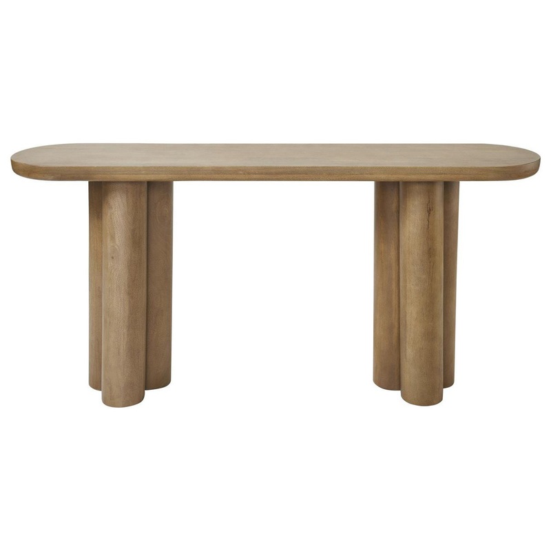 With a sleek look, the Ramona accent console table is a true showstopping piece of furniture. Put it to work in an entryway to make a lasting impression the minute guests walk through the door. Try it in a living room as a beautiful sofa table to create a spot to place a lamp and a carefully curated collection of treasures. In a dining room, it acts as a stylish bar or handy surface to set dishes down while serving a meal. Crafted from sturdy mango wood with a handsome light brown stained finish and designed with curved lines and slim dimensions that allow it to be placed against a wall in narrow spaces, this accent table is perfect for hallways, living rooms and dining rooms in any modern home.