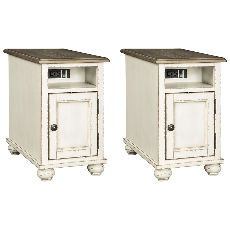 This 2-piece chairside end table set is traditional cottage styling made for modern living. Antiqued two-tone finish blends a chipped white with a distressed wood finished top for a double serving of charm. Cleverly placed AC power outlets and USB charging