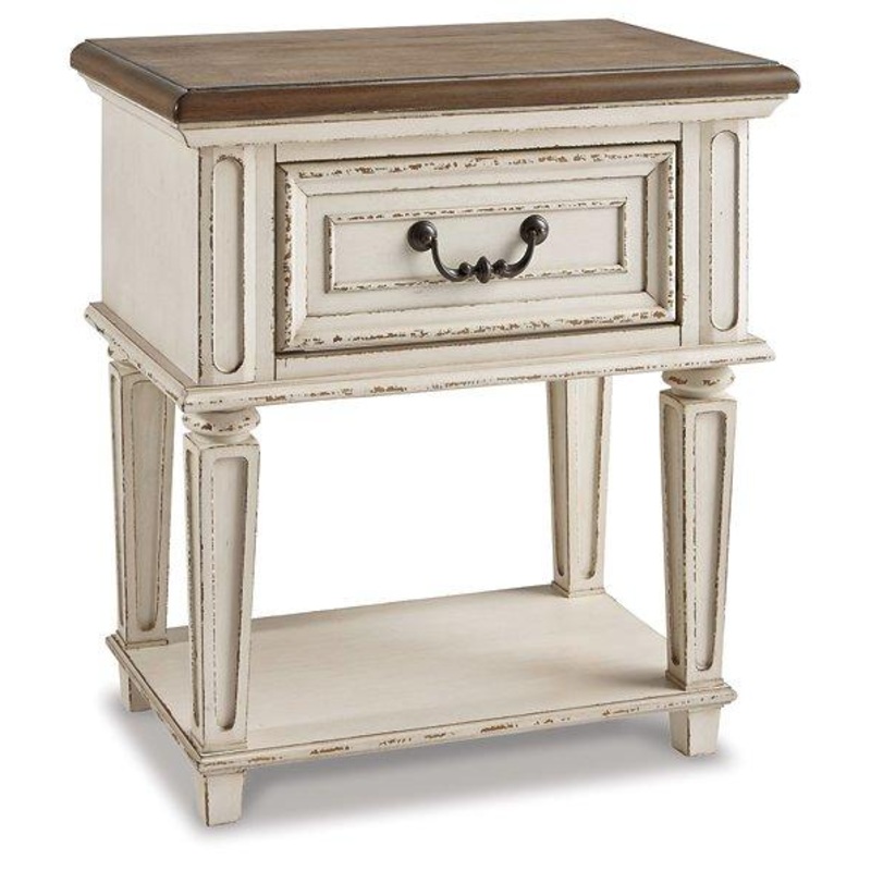 Elevating the art of traditional cottage styling, this nightstand is your dream bedroom retreat realized. Antiqued two-tone aesthetic blends a chipped white with a distressed wood finished top for added charm. Adorned with classic bail pull hardware, the smooth-gliding drawer is crafted with quality dovetail construction for years of satisfaction.