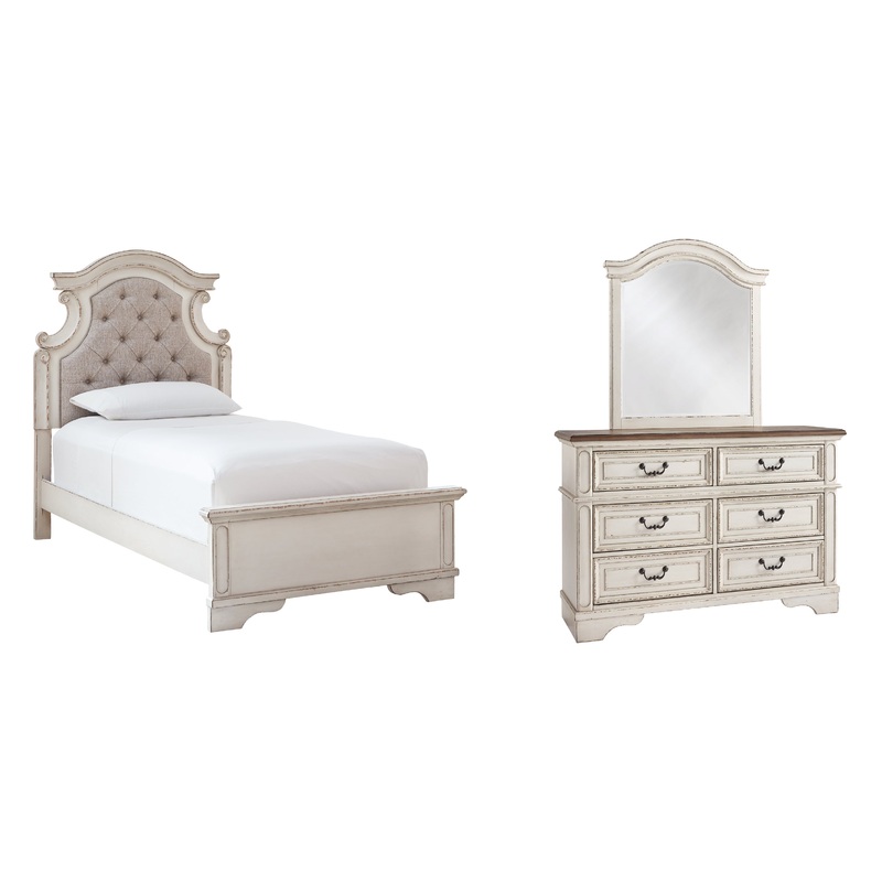 Elevating the art of traditional cottage styling, this bedroom set is your dream retreat realized. A sumptuous beauty, the upholstered bed wows with a distressed chipped white finish for heirloom appeal. Deep tufting on the cushioned upholstered headboard adds such a cozy element sure to put you at ease. Framed drawer fronts, decorative corbels, bail pulls and contrasting wood finished surfaces only add to the charm.