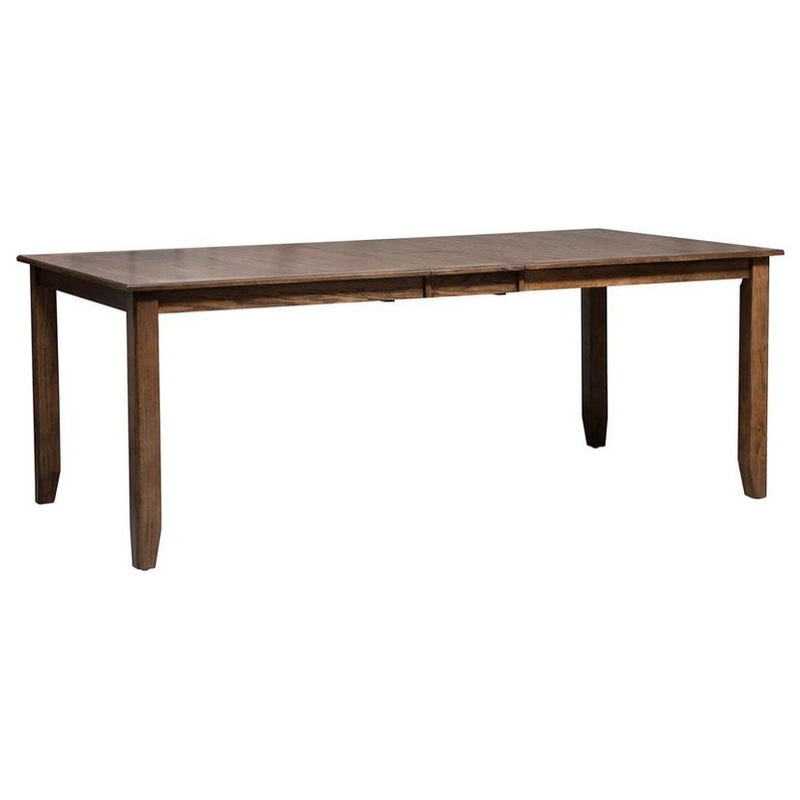 Gather around the Santa Rosa II rectangular leg table. Crafted of rubberwood solids and oak veneers, this piece features one 12-inch butterfly leaf on an easy guide leaf system, a table top with walnut inlays, and is anchored by beautifully tapered legs. Finished in an antique honey with a mission design, this table translates well into any decor.