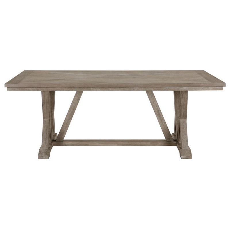 This dining table will be an ideal piece for any dining room. Perfect for casual or formal settings, this rustically styled table features a classically designed trestle base and wood-paneled table top. The natural appearance of the wood is easily noticed