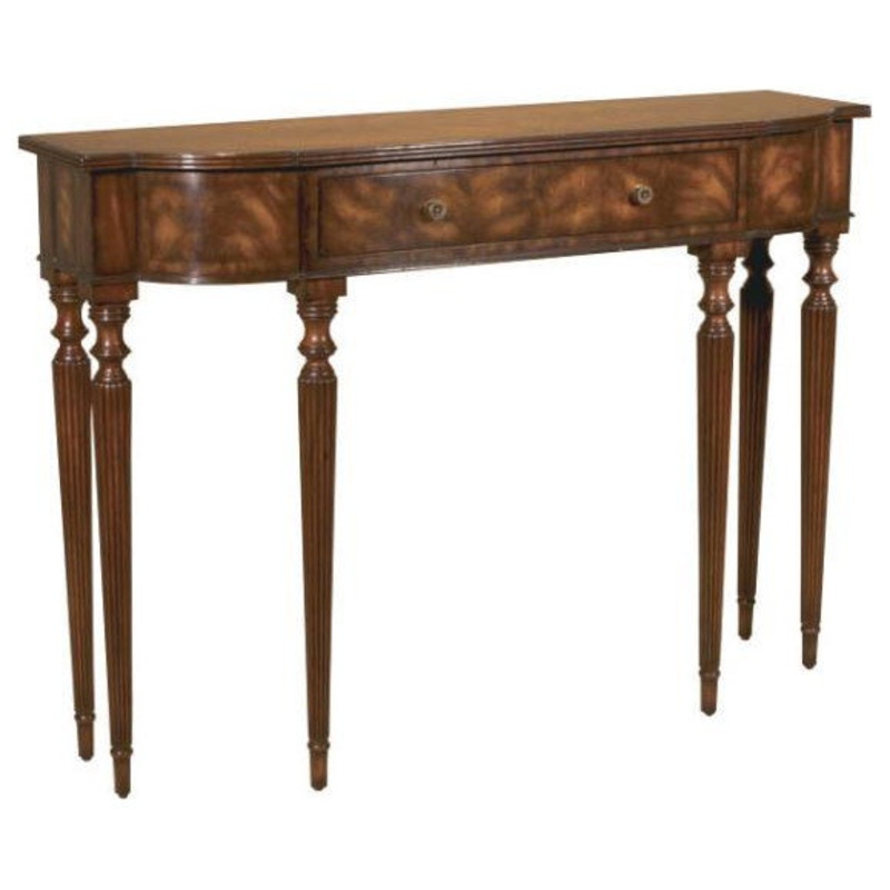 Sheraton console table. Aged regency finished mahogany sheraton console table, crotch veneer, tapered leg.