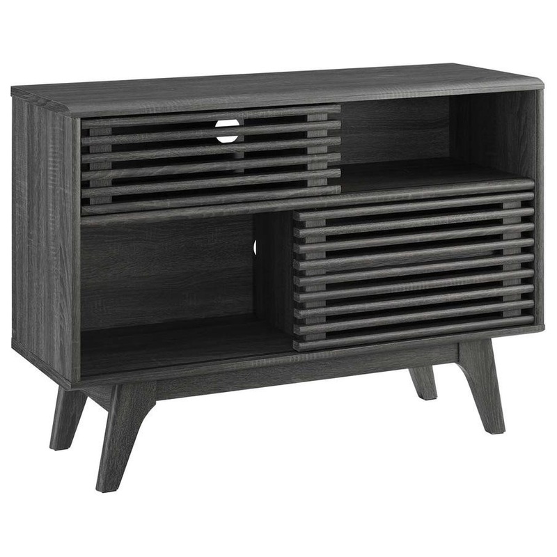 Tap into mid-century aesthetics with the Render Display Stand. Render features a durable particleboard frame with smooth walnut grain laminate, four tapered wood legs, four storage spaces with an adjustable shelf in the lower right section, non-marking foam foot pads, and dual slatted sliding doors for sophisticated living room or entryway storage. Complete with cable management holes on both sides, Renders contemporary linear style is the perfect display stand for books, magazines, pictures, table lamps, and indoor plants.