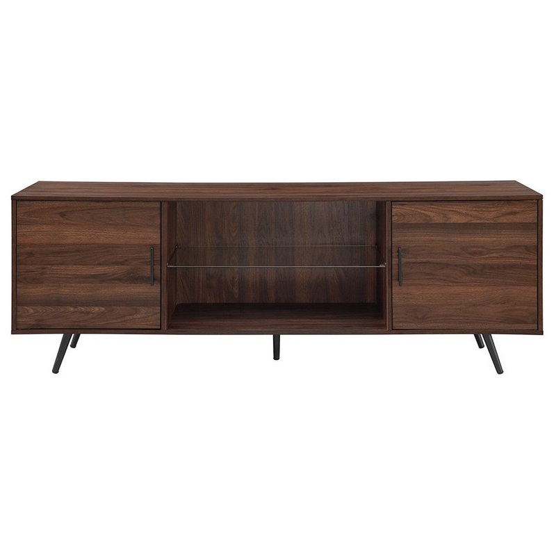 -Includes a center glass shelf for a sleek appearance -Angled legs and boxy silhouette create a mid-century modern appeal -Use in your living room as a TV stand, bedroom as a storage console, or dining room as a buffet -Cord management and adjustable shelv