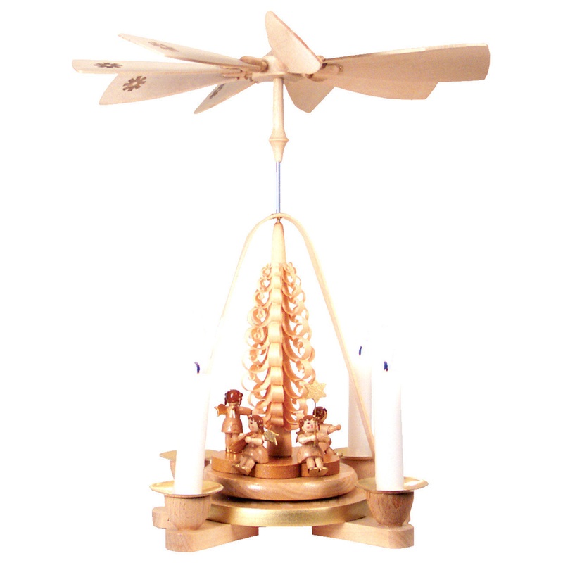 Whether you are looking for the final touch as you decorate for a holiday party or simply want to add new life to your holiday decorations, the Richard Glaesser Musical Angels Pyramid will add decorative and sentimental value to your space. The design features angels playing instruments next to a pine tree. Used as a traditional table decoration, this piece originates in Germany and uses wax candles. Heat rising from the candles turns the paddles and base, creating a beautiful holiday display. Measuring 9 by 10.5 inches, the pyramid is made of natural wood. *Candles not included.
