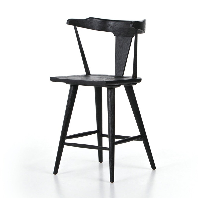 A fresh, counter-height take on mid-century Windsor seating, featuring a bowed, sculptural silhouette and soft black finish to highlight the natural grain of weathered oak.