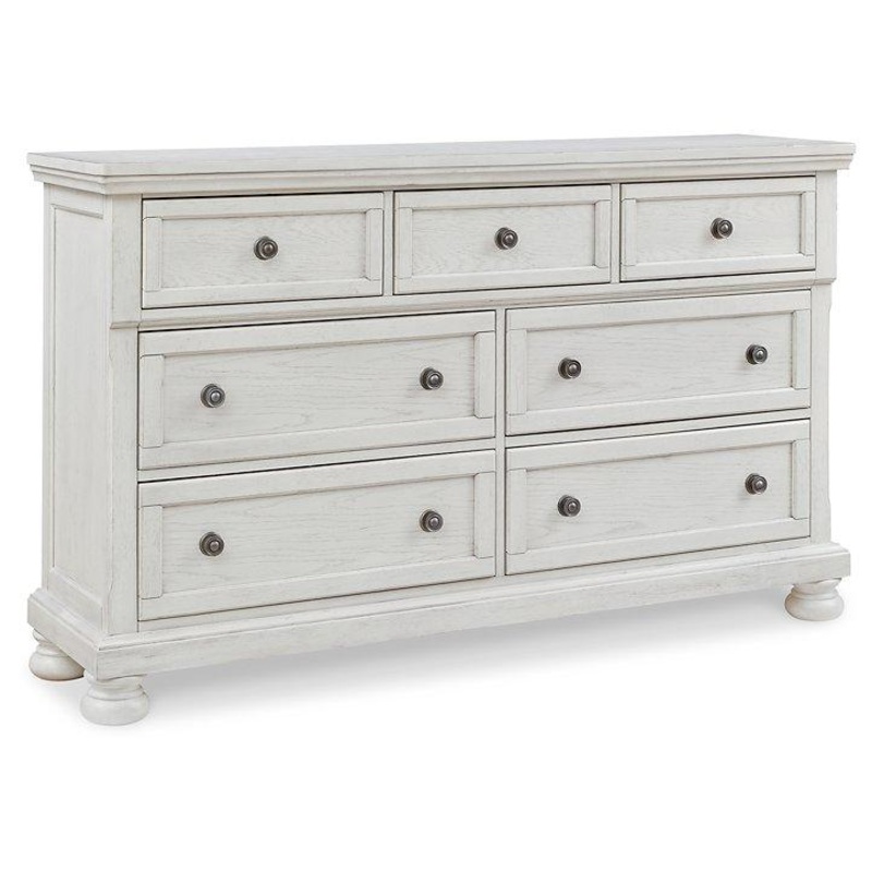 Elegant, timeless furnishings take your bedroom to the next level. Nothing does that better than this dresser. The antiqued white finish with a wonderful grain texture radiates sophistication, while the dark bronze-tone hardware adds an ornate touch. A hid