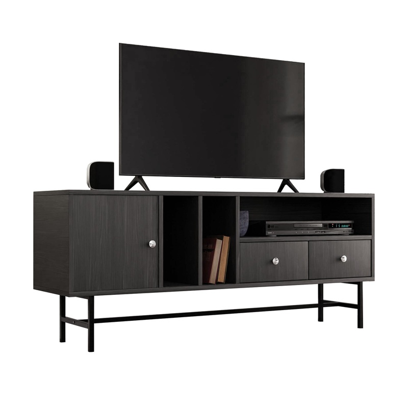 -This TV stand combines open shelves, two drawers, and a spacious cabinet to provide versatile storage for media devices, books, and decorative items, ensuring organization and reducing clutter.