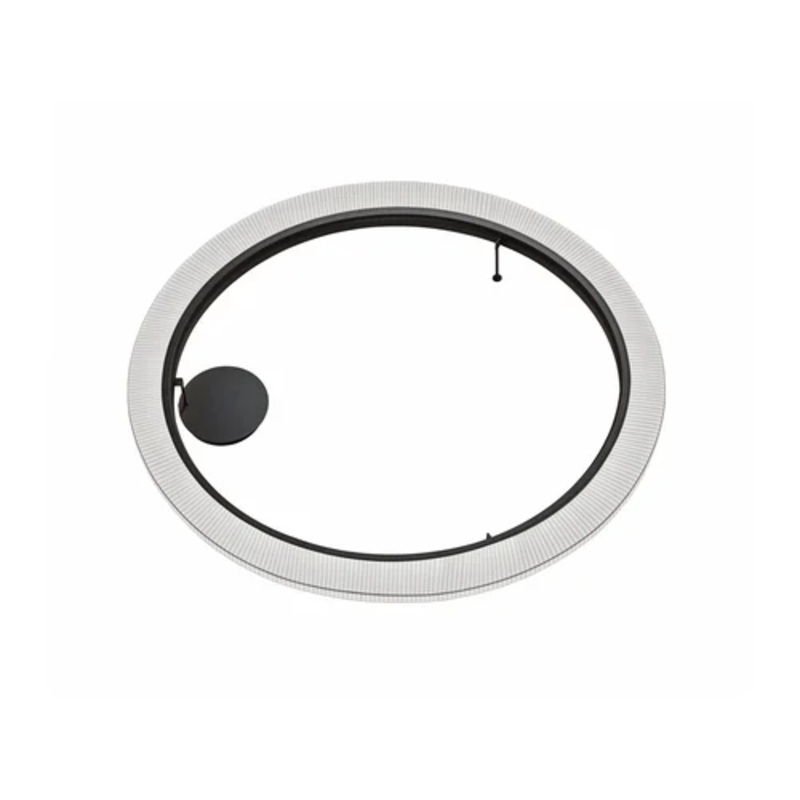 The Roda collection is characterised by a large cylindrical ring-shaped shade. Its inner contour is surrounded by an aluminium ring that contains a continuous circle of LEDs, which emit a uniform, filtered light. The warmth of the ribbon is emphasised by the dark ring outlining the perimeter, making these lighting solutions particularly cosy and lightweight, because despite their large volume, they seem weightless.