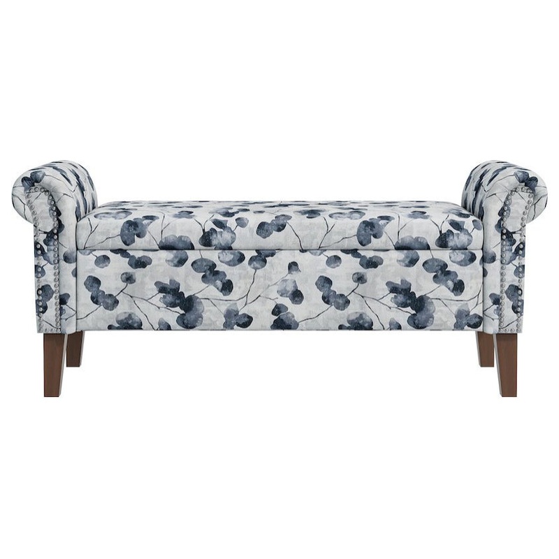 Stylish and functional, this bench storage ottoman is covered in an elegant floral bonsai fabric. Comfortably padded, the hinged top lifts easily to store items out of sight. Rolled arms and hand-applied pewter nail head trim lend a traditional touch. Perfect at the end of the bed, in your living room, or in an entryway, the bench is fitted with solid wood square tapered legs in a dark brown finish.