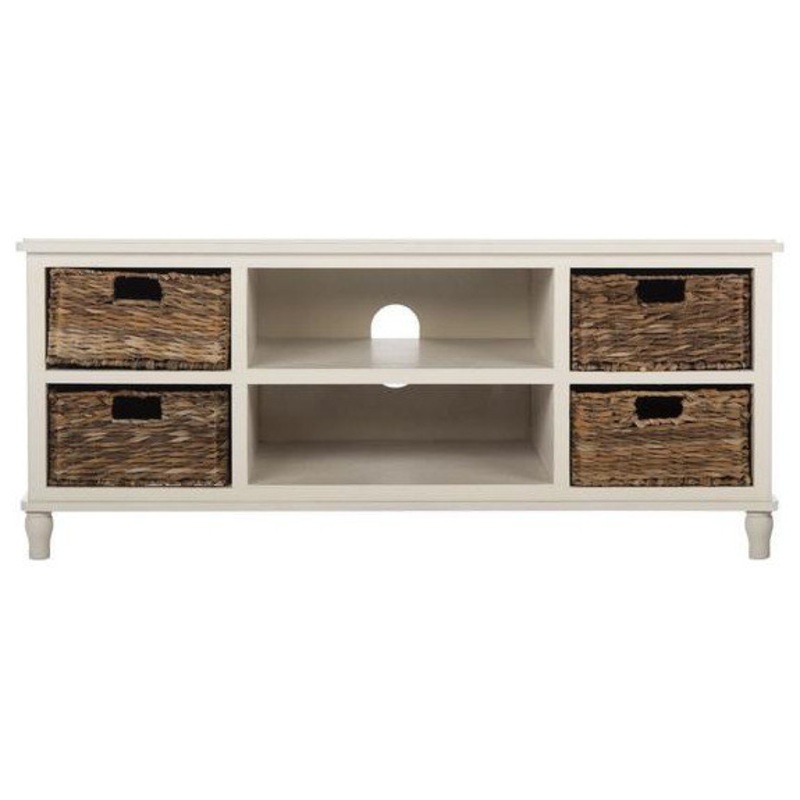 The ideal TV unit for coastal and country interiors, this pine piece in distressed white finish has natural rattan baskets with cutout handles to make finding all entertainment essentials a breeze. A pretty organization solution for condo or cottage. -Fram