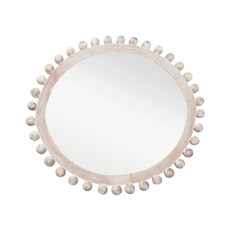 -A boho-inspired wall mirror that showcases an intricately carved wood frame in a whitewashed finish