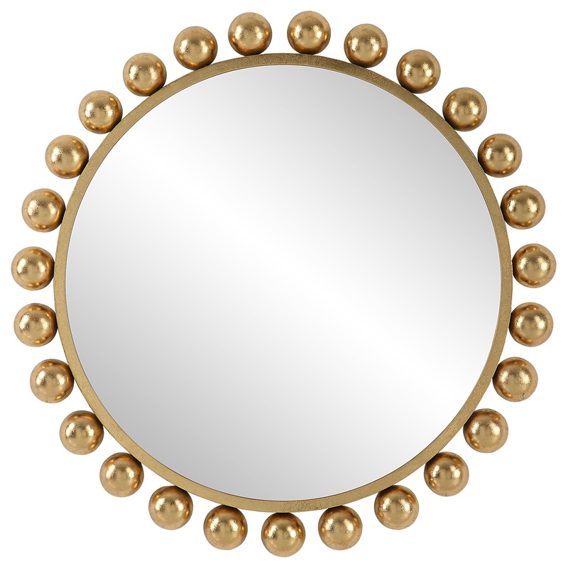 -Make a statement with this 34" round metal mirror, surrounded by 2.5" hemispheres.The simple and sleek inner frame allows the focus to be on the dome shaped ornaments. Finished in a rich gold foil, this mirror will be a focal point in any room. Also a -Fi