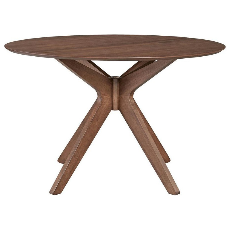 Gather the family around the Space Savers round pedestal table. Crafted of rubberwood solids and walnut veneers, this piece features a satin walnut finish, fixed top, and is anchored by a unique architectural style base. This table is sure to create a simp