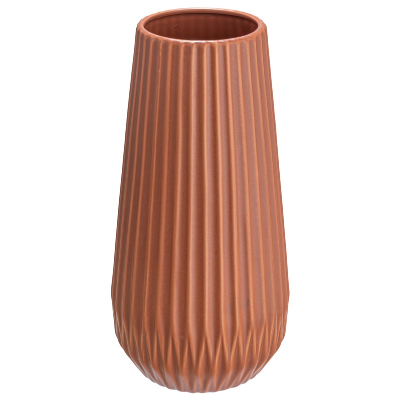 This terracotta stoneware fluted vase with embossed lines is a unique and eye-catching piece of decor that can elevate any space. The vase's fluted body and narrow neck create a geometric pattern that adds texture and dimension to the matte terracotta glaz