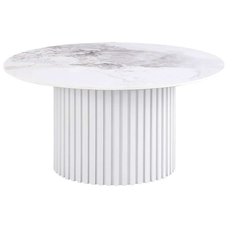 This round coffee table showcases a luxurious sintered stone top with elegant veining, offering durability and style for modern living spaces. The sturdy metal base features a fluted design and a sleek white powder-coated finish, providing a clean and contemporary look. Its robust materials ensure stability while creating a statement piece that pairs functionality with artistic flair. Ideal for living rooms, this table blends timeless aesthetics with everyday usability.