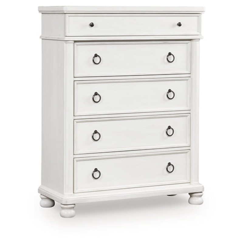 Taking a laid-back approach to casual traditional design, this artfully crafted chest of drawers combines classic elements with a clean modern approach. Its rubbed antiqued white finish exudes a comfy, timeless appeal that's sure to carry you away to a dre