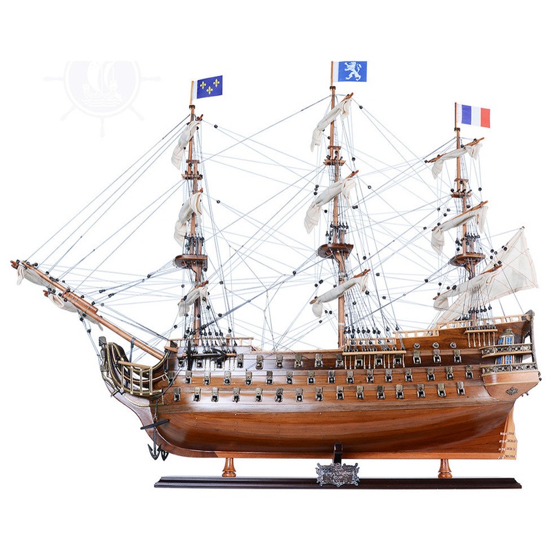 -About the Royal Louis E.E. model shipThis is a magnificent museum quality model of the Royal Louis. It was 100% hand builtplank on the frameby the master craftsmen. This model is made of mahogany and teak. Stripes of rosewood were added to increase its exotic value. Around her hull, you can see brass cannons, brass rails and fittings, a big brass figurehead in front of the bow, beautiful art works around the stern. On the deck, there are stairs connected different floors; a big wooden dinghy that comes with its own paddles, sky light panel, ship wheel, ship bell’etc. The details are just amazing. It takes hundreds of hours to build the hull and the riggings. The model comes with its original French flags and rest on a steady wooden base with attached metal name plate. This is an exclusive edition of the Royal Louis, where the model is uniquely identified by a laser cut hull serial number.