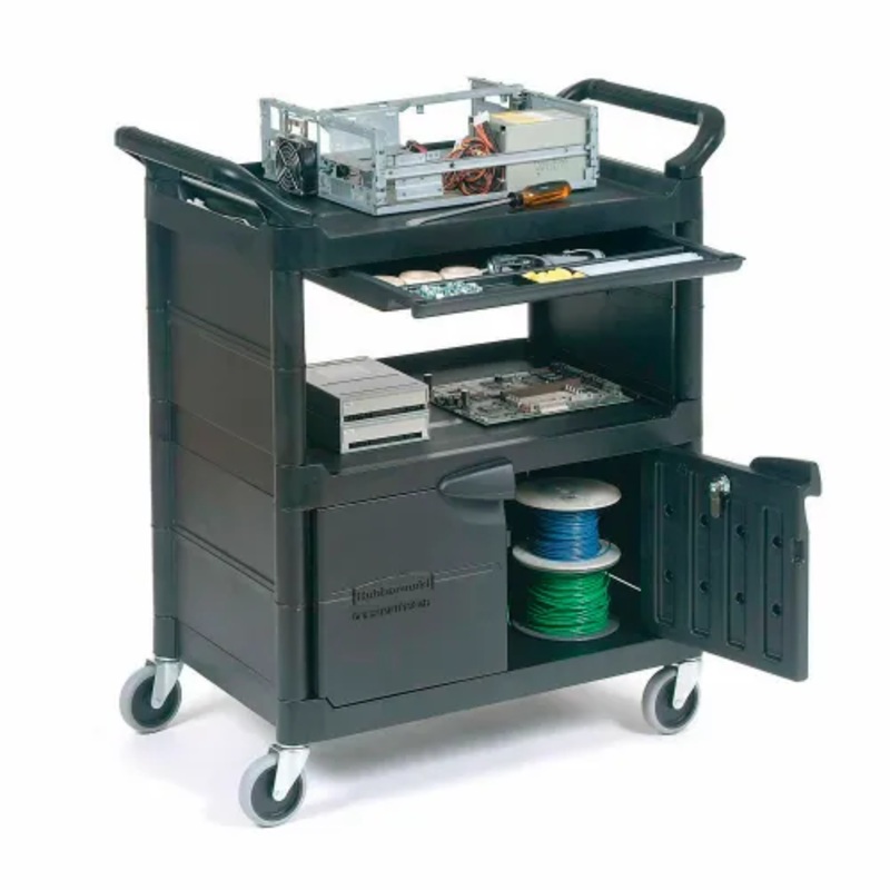 Durable and smooth plastic construction is non-conductive, easy to clean and corrosion resistant. Locking Cabinet (26″L x 17-1/2″W x 11-1/2″H) protects valuables. Sliding Top Drawer (19″L x 15-3/4″W x 1-3/4″H) offers convenient storage for tools and supplies. Shelves have lip to retain cargo. 9-3/4″ shelf clearance. Ergonomic easy-grip handles on each end offer easy steering. Rolls quietly on 4″ non-marking rubber swivel casters. Assembles easily.