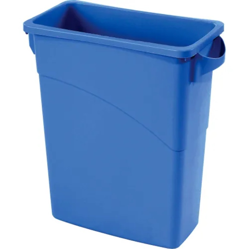 This recycling container space saving profile fits virtually anywhere. Rubbermaid Slim Jim container features venting channels that make removing liners up to 80% easier, improving productivity and reducing the risk of worker injury. Includes bag cinches to secure liners around the rim of the container and allow for quick, knot-free liner changes. Base and rim handles improve grip and control while lifting and emptying full containers. Long lasting durable plastic construction resists dents, cracks and corrosion. Lids sold separately.