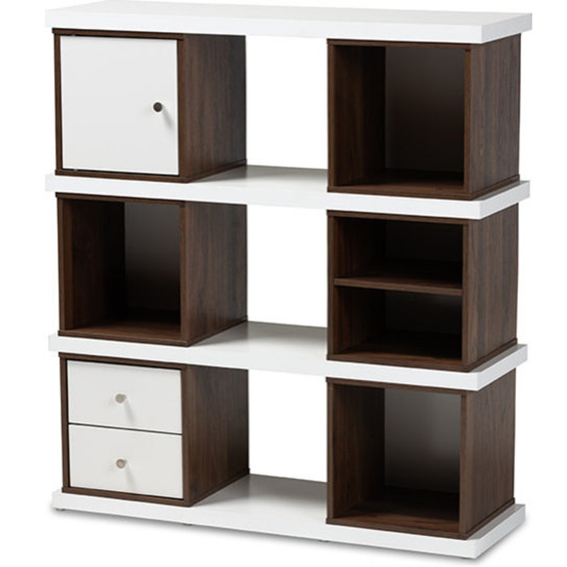 Refresh your book collection setup with the chic design of the Rune bookcase. Clean lines and a two-tone white and walnut brown finish give this wooden bookcase a cool, contemporary look. Eight open shelves of varying sizes provide space to display all your favorite books and knick-knacks. Two drawers and one compartment behind a door provide concealed storage space. Silver knobs add a sleek touch. The Rune bookcase is made in Malaysia and requires assembly.