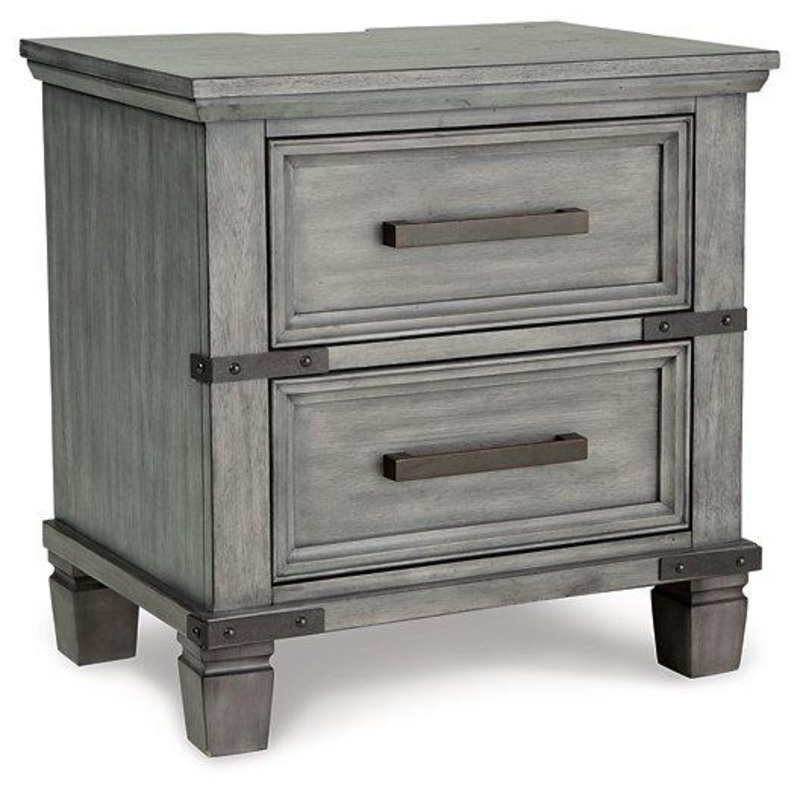 What's old is what's new with this nightstand. Serving up a fresh look in urban farmhouse style, this eclectic piece features a light weathered gray finish with dark aged bronze-tone bar pulls and metal straps for a casually cool sensibility. Profiled draw