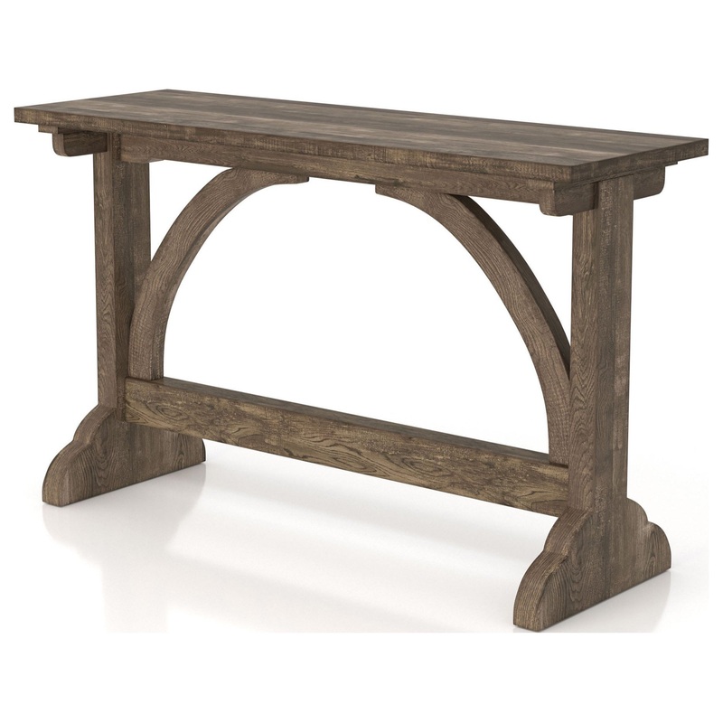 -Includes: One (1) console table -Style: Rustic -Finish: Reclaimed Oak -Materials: Particle Board -Decorative curved base supports -Arch accents -Spacious tabletop -Wood grain accents -Comes with assembly instructions -Overall dimensions: 47.24"L x 15.75"W