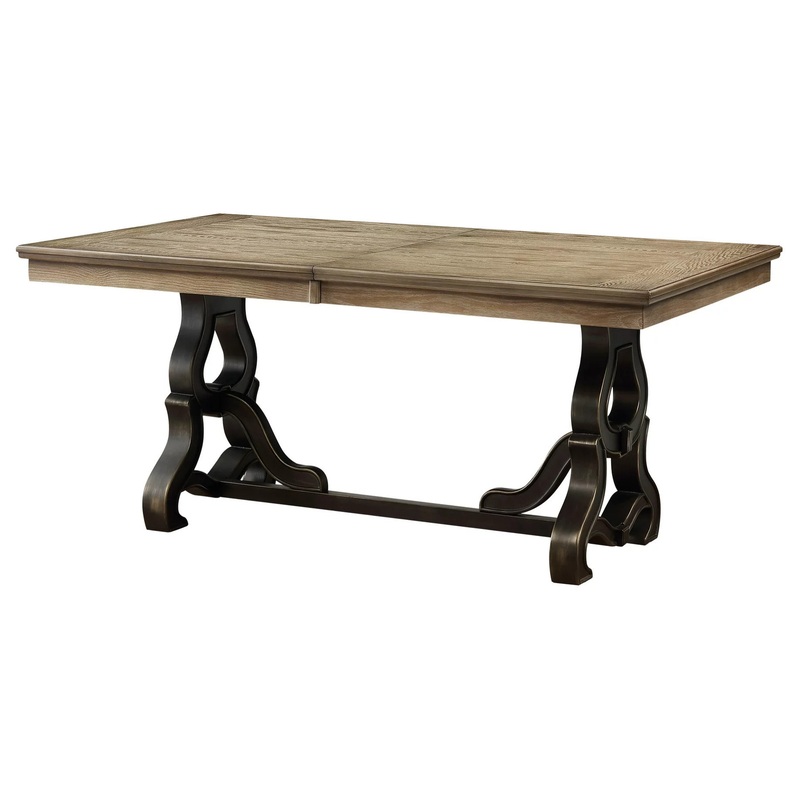 -Rectangular Dining Table -Wooden Top -Ornate Metal Trestle Base -Wooden Slat Backrest -Wood Tapered Leg -Nail-head Trim SeatProduct ID198392786Manufactured ByDecor LoveSold ByDecor LoveSize/WeightW 86" / D 42" / H 30" / 165 lb.MaterialsSteel Metal, Poplar