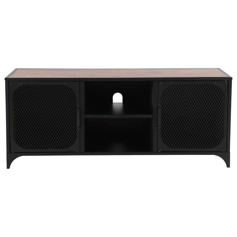An industrial look TV cabinet with steel frame, 2 metal mesh cabinet doors and a media shelf. Includes hole for wire management.