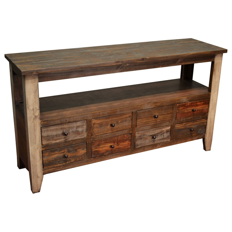 -Rustic Sofa Table with 8 drawers / TV Media Stand -Distressed painted Pine wood with hand rubbed protective finish that won't fade -Top carpentry techniques have been used to eliminate wood splitting and paint chipping -Rustic Farmhouse look Dimensions: -