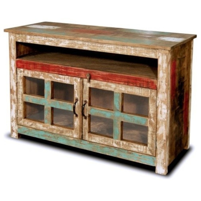 The La Boca Collection: Distressed and brightly painted solid wood furniture for the living room, dining room, and bedroom -Solid pine wood -Distressed and painted by hand -Open space behind glass doors Product Dimensions:Overall: 45W x 16D x 30H Open shel