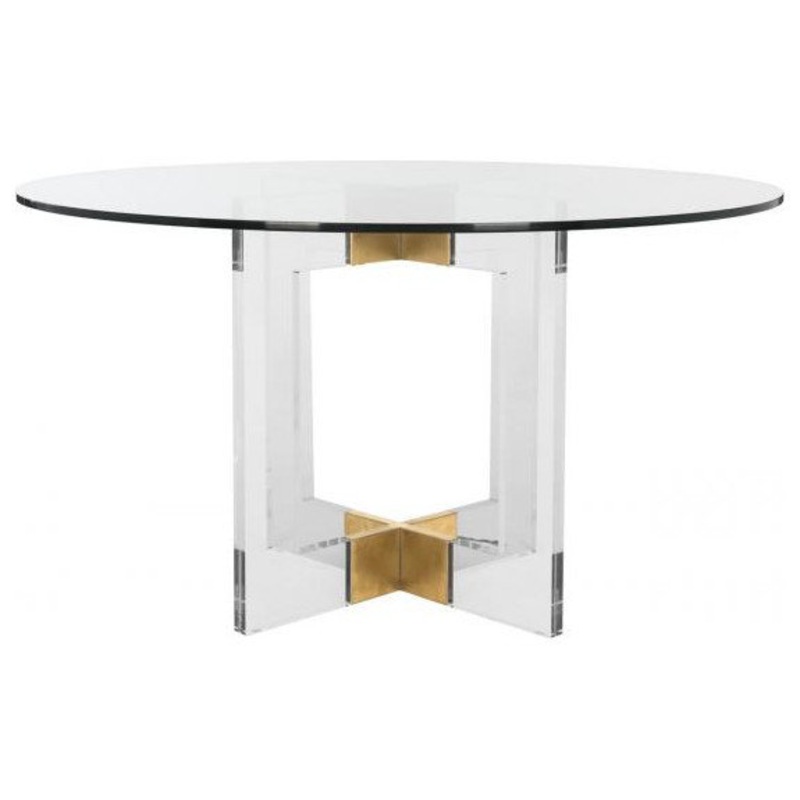 Coveted designer furnishings at NYC's top auction house inspired this contemporary Round Glass Dining Table. Crafted with a dramatic acrylic base with brass finished stainless steel, its posh glass top brings timeless style to the modern dining room. Model