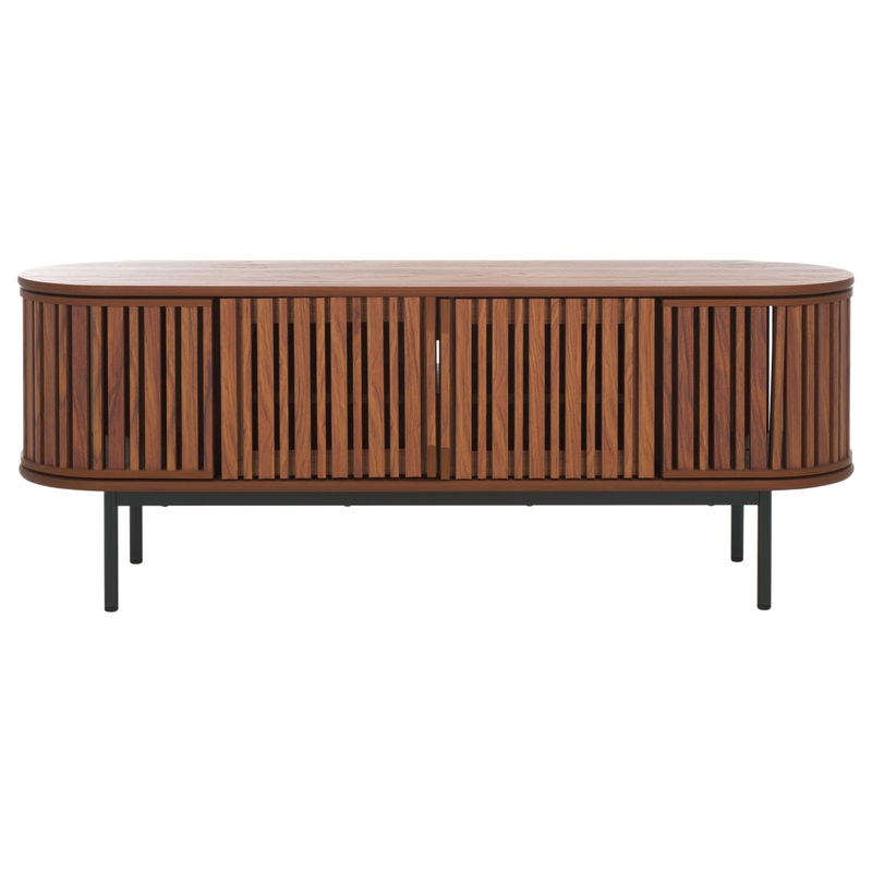 Make a chic and sleek statement with our Enid media stand. The sleek and inviting profile of our media stand is elevated with expert craftsmanship and chic details. The contemporary storage unit is softened with rounded edges. The facade features a beautifully slatted surface to add dimension and textural intrigue. The media stand receives an airy lift with black metallic post legs. Featuring a rich walnut finish, our wooden media stand adds style and functionality to a variety of styles. It includes four roomy cabinets to hide media essentials, electronics, and more.