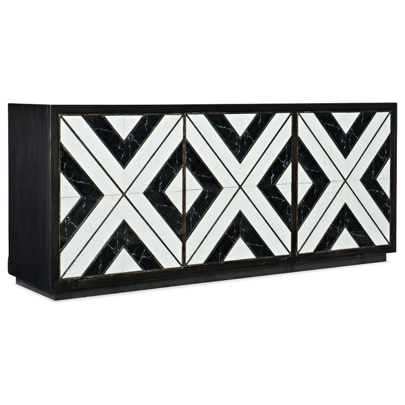With an intriguing matrix design, the Noir Et Blanc Entertainment Console is a dramatic and striking focal point to punch up any interior. The exquisite door fronts have reverse handpainted glass designed to look like marble. The case is finished in Noir, a black paint with rich brown undertones, and the antique silver colored tab pulls add a luxurious touch. The 3 doors have soft close hinges, and there is one adjustable shelf behind the left pair of doors and one adjustable shelf behind the right door. Crafted of Poplar and Hardwood Solids with Oak Veneers and Glass, there is a ventilated back panel and 3 electrical outlets included. Accommodates up to an 80-inch TV.