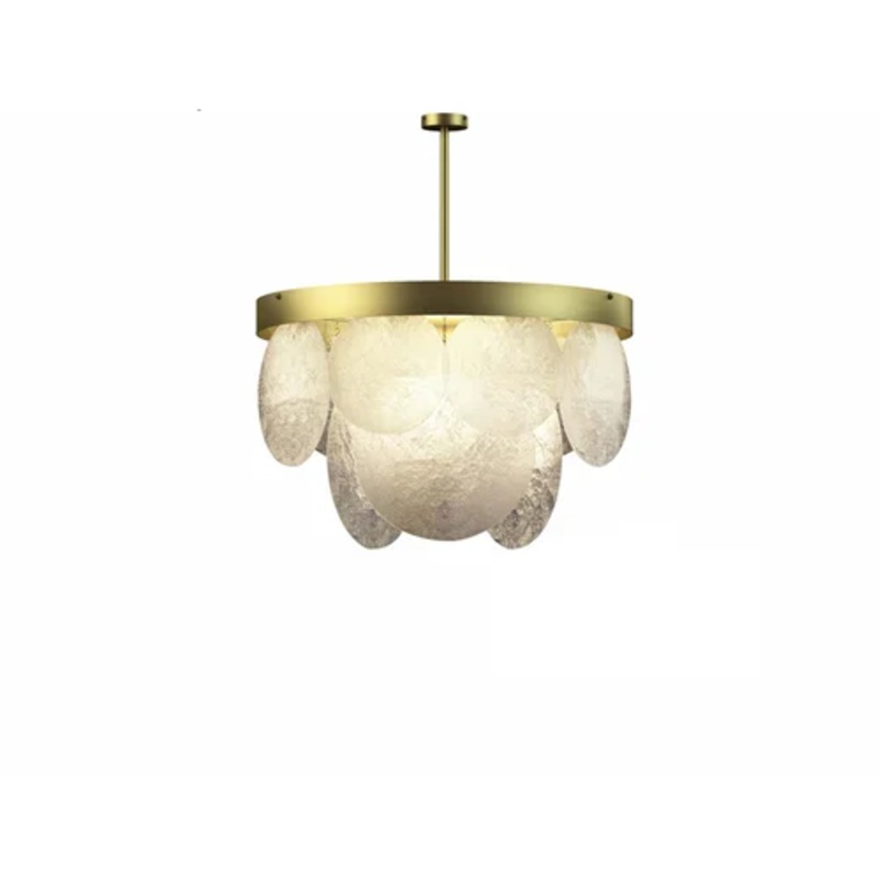 This lamp consists of a luxurious brass collar, from which glass handcrafted by expert craftsmen hang through a process that allows the glass to form undulations and textures that will make the emission of light unique. Each chandelier is a unique and unrepeatable piece thanks to the handmade glass, and the warm and soft light that is emitted will impose its presence in every room. CTO Lighting creates another small design jewel, ideal for any environment.