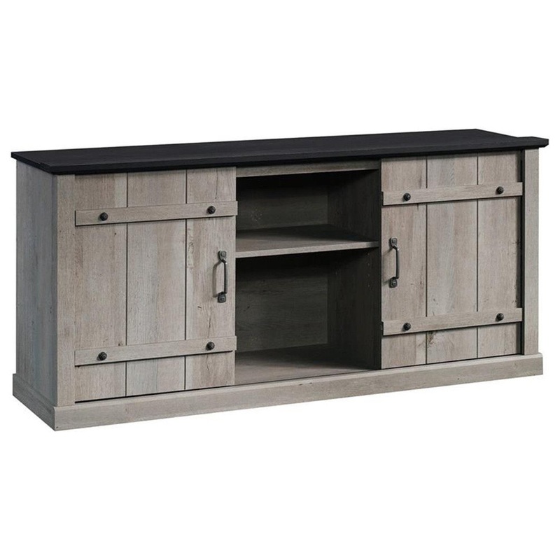 Farmhouse is in, and it's not going anywhere. This modern farmhouse TV stand from the Sauder Select collection reminds you of simpler times with rustic charm and unique design. This TV credenza accommodates up to a 70" TV weighing up to 95 lbs., making you